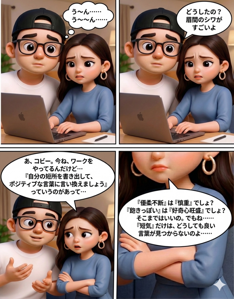 サニー:「あ、コビー。今ね、◯◯の講義で出されたワークをやってるんだけど…**『自分の短所を、ポジティブな言葉に言い換えましょう』**っていうのがあって…」