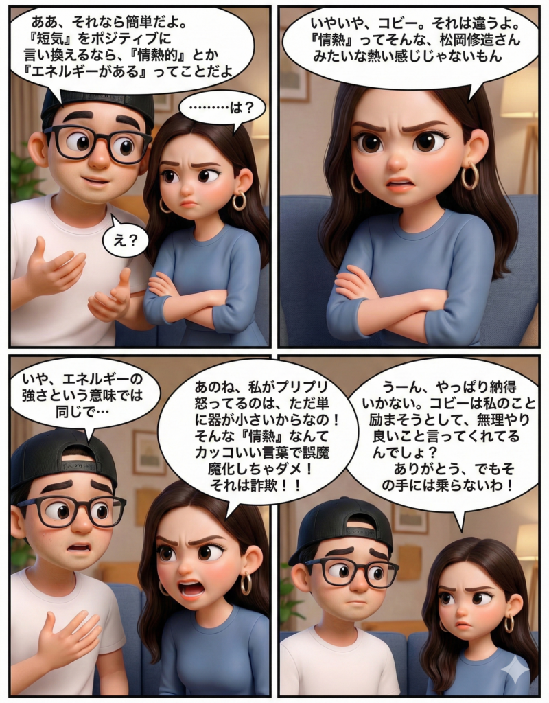 僕:「ああ、それなら簡単だよ。『短気』をポジティブに言い換えるなら、**『情熱的』とか『エネルギーがある』**ってことだよ」
