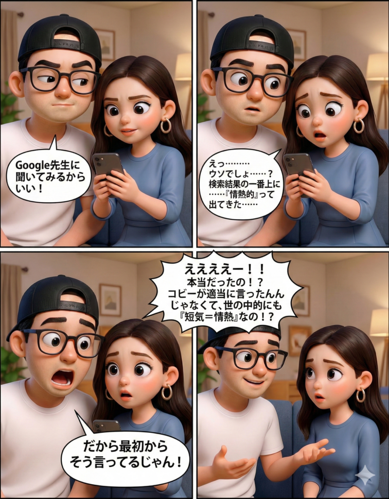 サニー:「ええええー!! 本当だったの!? コビーが適当に言ったんじゃなくて、世の中的にも『短気=情熱』なの!?」