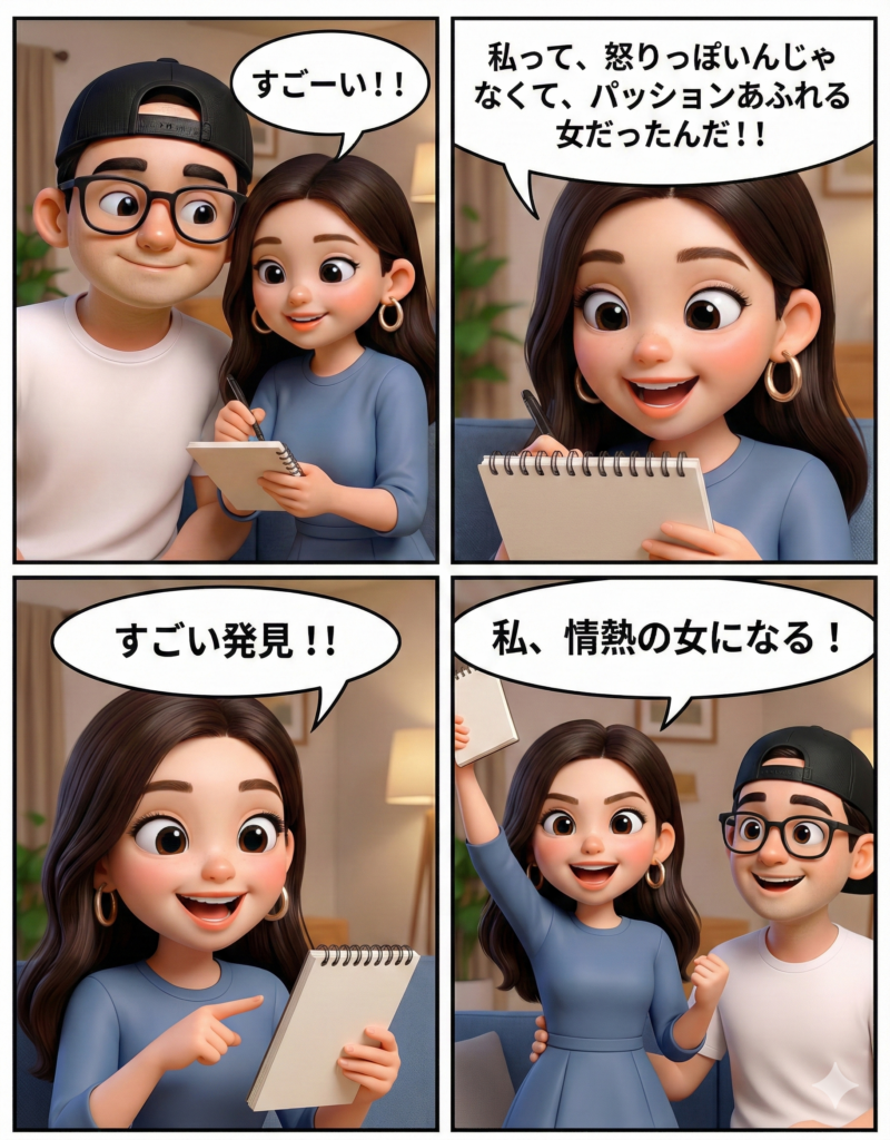 サニーは**「私、情熱の女になる!」**と、キラキラした目でノートに書き込んでいました。